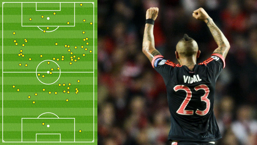 To his credit, Guardiola had recognised Vidal’s ability to transform Bayern’s play from ponderous and predictable to razor-sharp and breathless. He had used the Chilean as a modern “libero” briefly – to especially good effect against Borussia Dortmund – but now he has him lining up closer to the side’s not-quite-as-prolific-as-usual strike duo. Importantly, he brings verticality to a style of play that can become a little too side-to-side.